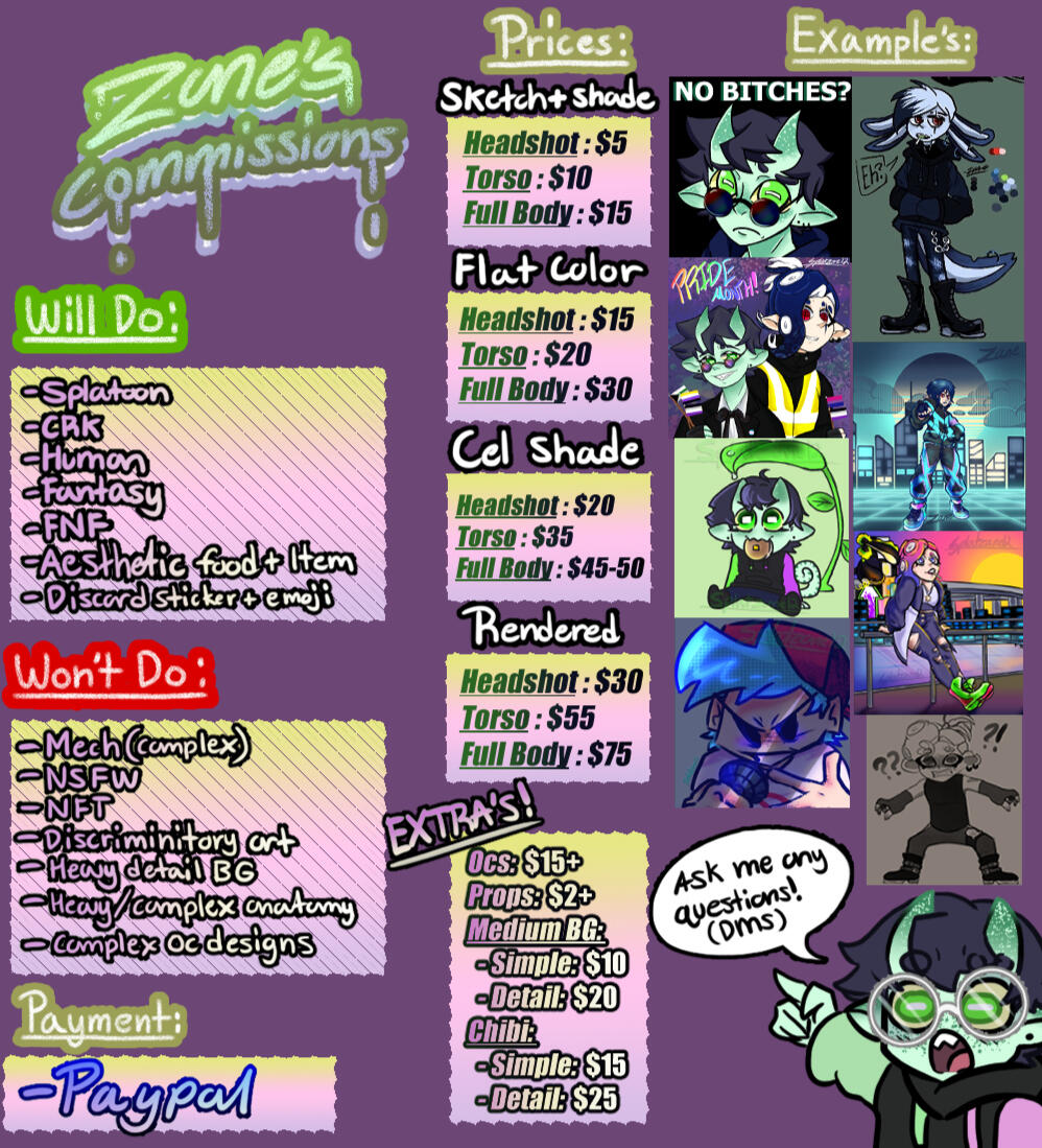 When commissioning, you will have to pay up front first when the client has payed 50% & 50% after or full in only USD. (I have two different payments of CashApp & Paypal) Any commercial use will be a 15% fee.